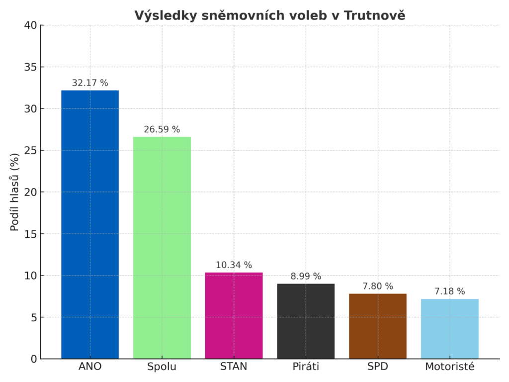 Sněmovní volby v Trutnově jednoznačně vyhrálo hnutí ANO, které získalo rovných pět tisíc hlasů a podíl 32,17 procenta. Druhá skončila koalice Spolu s 4 132 hlasy a výsledkem 26,59 procenta. Rozdíl mezi oběma uskupeními tak činil 868 hlasů, tedy přibližně pět a půl procentního bodu.