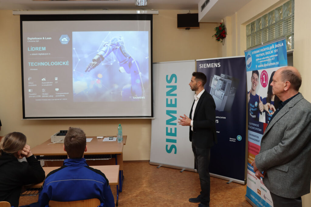 Lukáš Adamec poté představil přítomným žákům a učitelům firmu Siemens, její bohatou historii v Trutnově a široké portfolio výrobků s důrazem na moderní výrobní technologie, automatizaci, robotizaci a digitalizaci. „Setkání vnímám jako skvělou příležitost setkat se s mladými technickými talenty našeho kraje, sdílet s nimi vize a diskutovat o nových technologiích a přístupu k udržitelnosti,“ uvedl Lukáš Adamec. Markéta Turková studující seznámila s možnostmi pracovního uplatnění a předala všem zúčastněným propagační předměty Siemens.