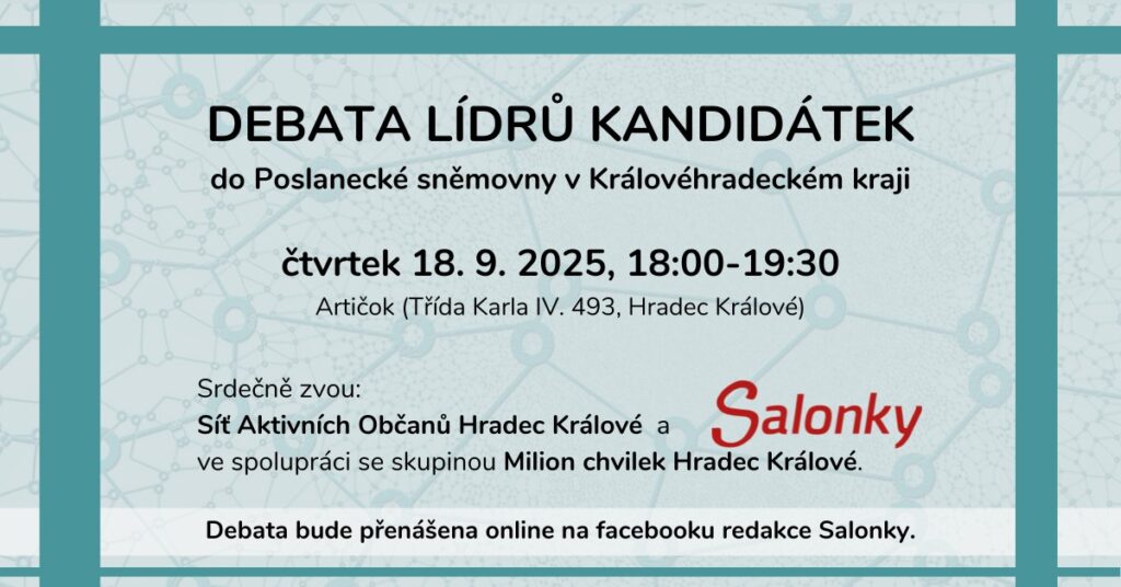 Láká vás možnost slyšet názory kandidátů do Poslanecké sněmovny z první ruky? Přijďte už tento čtvrtek od 18 hodin do kavárny Artičok (Třída Karla IV. 493, Hradec Králové) na jedinečnou debatu krajských lídrů kandidátek. Akce je veřejná a zdarma, a pokud se nemůžete zúčastnit osobně, debatu budete moci sledovat živě na facebookových stránkách Trutnovinek. Čtvrteční debatu pořádá vydavatelství TN Media ve spolupráci se Sítí aktivních občanů Hradec Králové a skupinou Milion chvilek Hradec Králové.