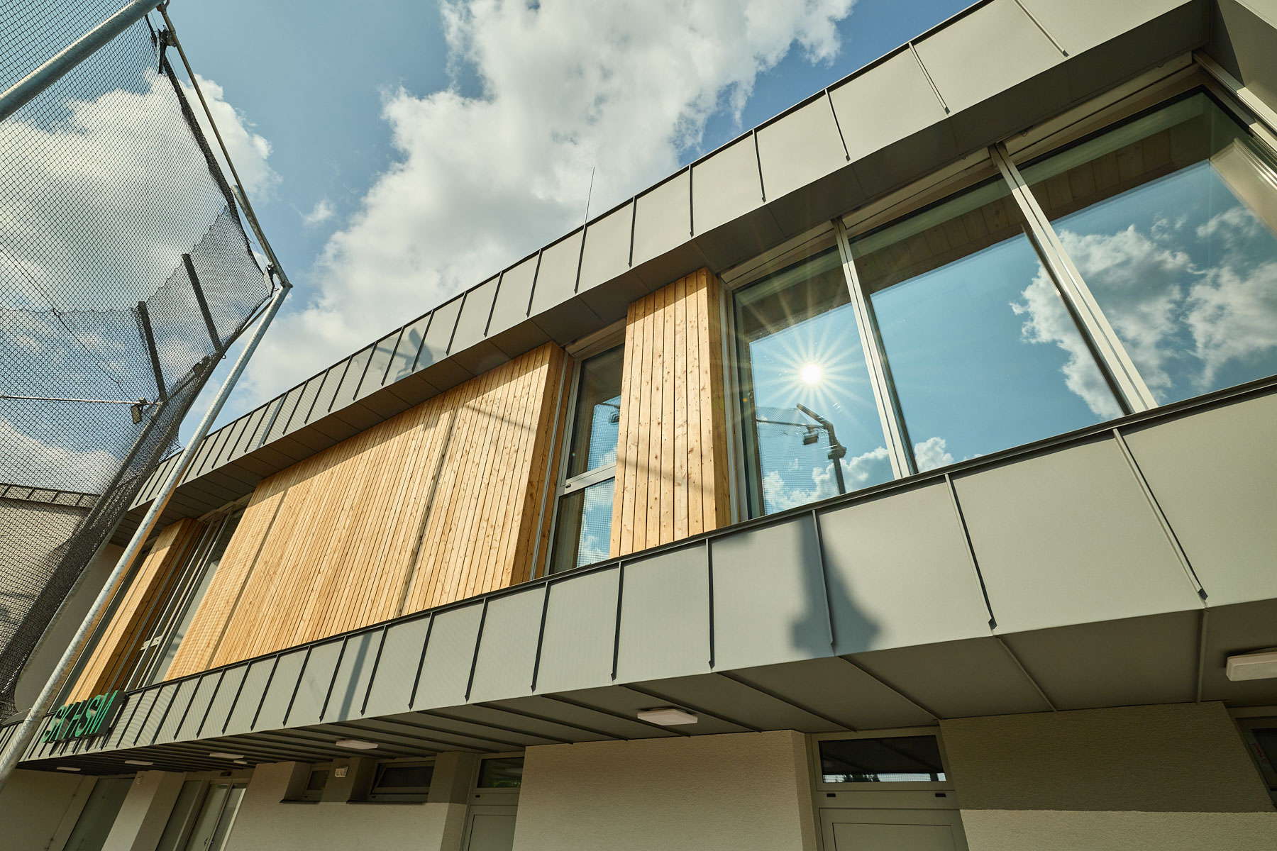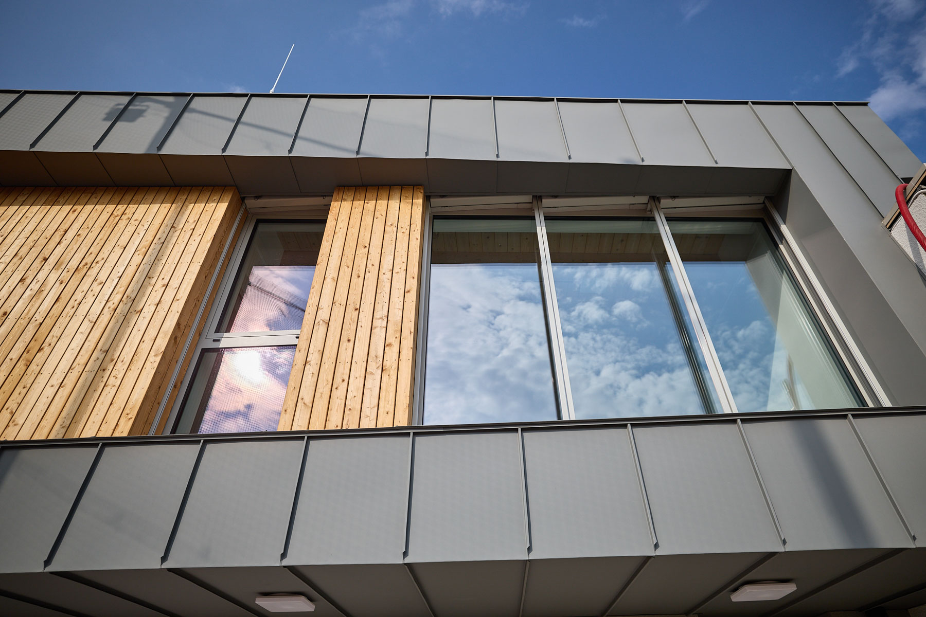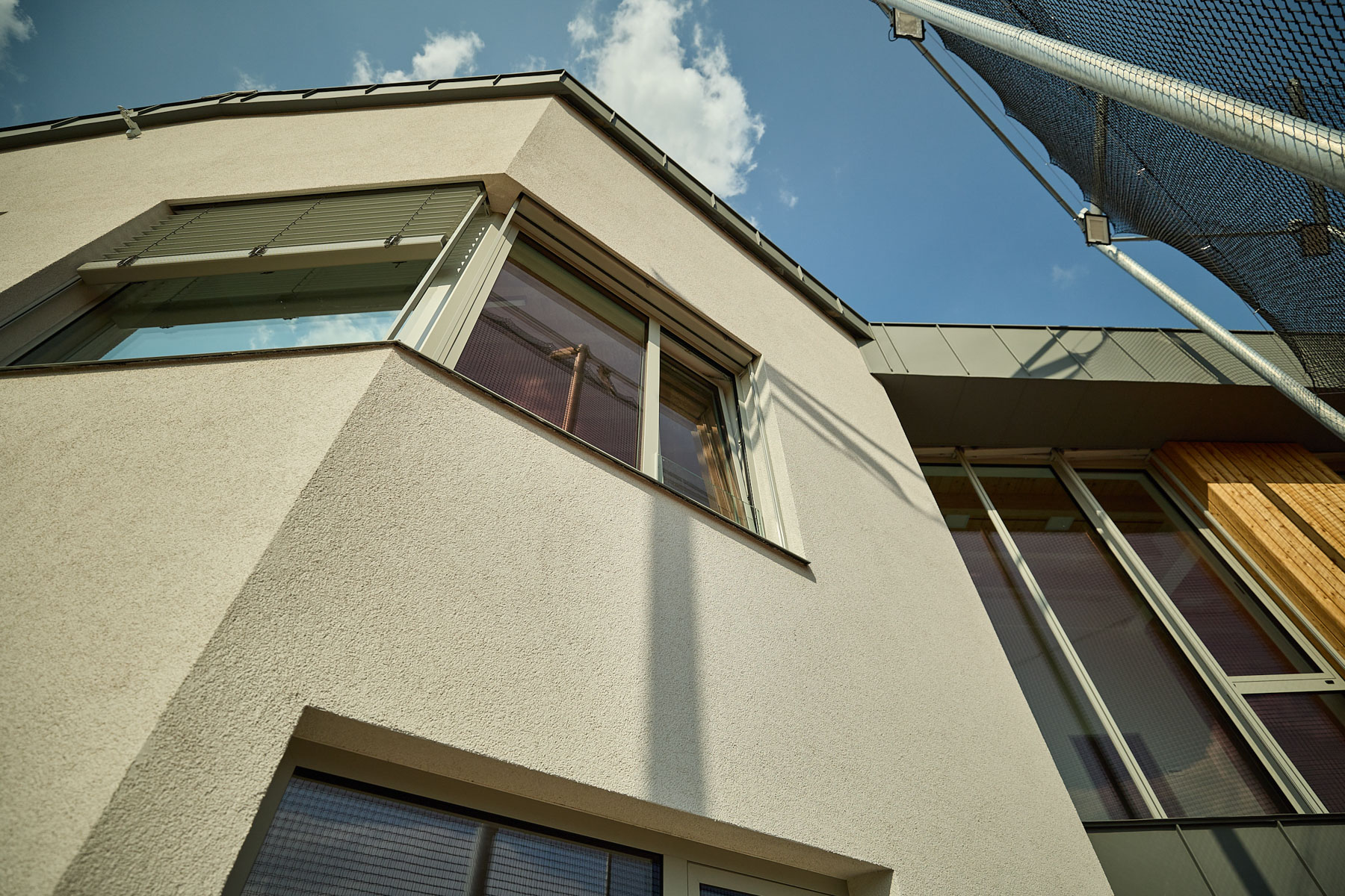 Architekti zvolili vizuálně výrazné řešení, když spojili původní dvoupatrovou část s novostavbou pomocí oplechovaných rámů a velkých prosklených ploch, mezi kterými je modřínové dřevo. „To je taková hlavní myšlenka, že horní patro jakoby opticky pluje nad tím spodním,“ vysvětluje autor návrhu. Výrazné rámy na fasádě spolu s přírodním dřevem vytvářejí moderní a příjemný dojem.