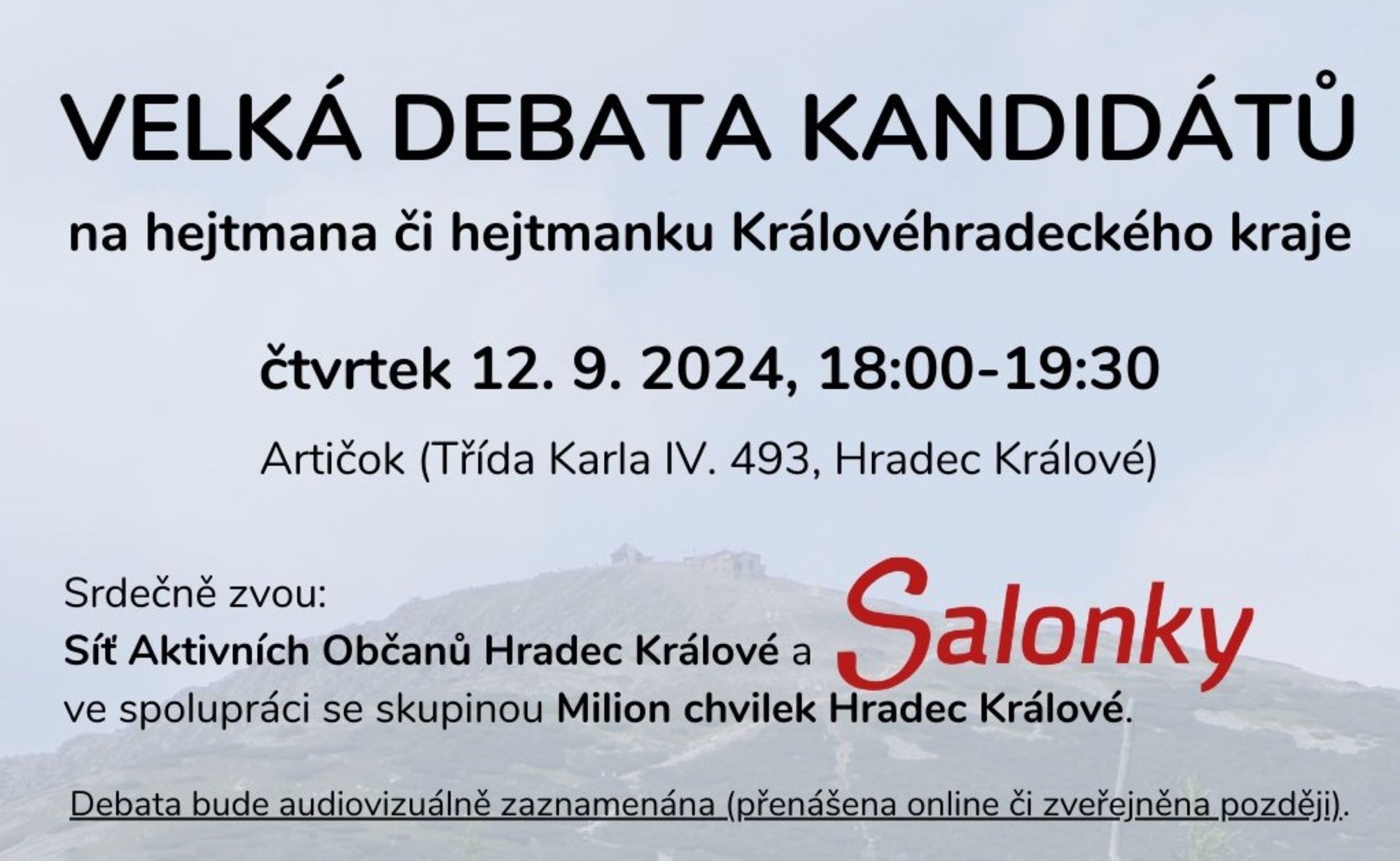 Předvolební debata v hradecké kavárně Artičok začíná ve čtvrtek 12. září v 18 hodin a bude trvat 90 minut. Vstup na debatu je zdarma do zaplnění sálu. Celou debatu můžete také živě sledovat na facebookové stránce Salonky HK , kde bude možné zhlédnout debatu také později ze záznamu.