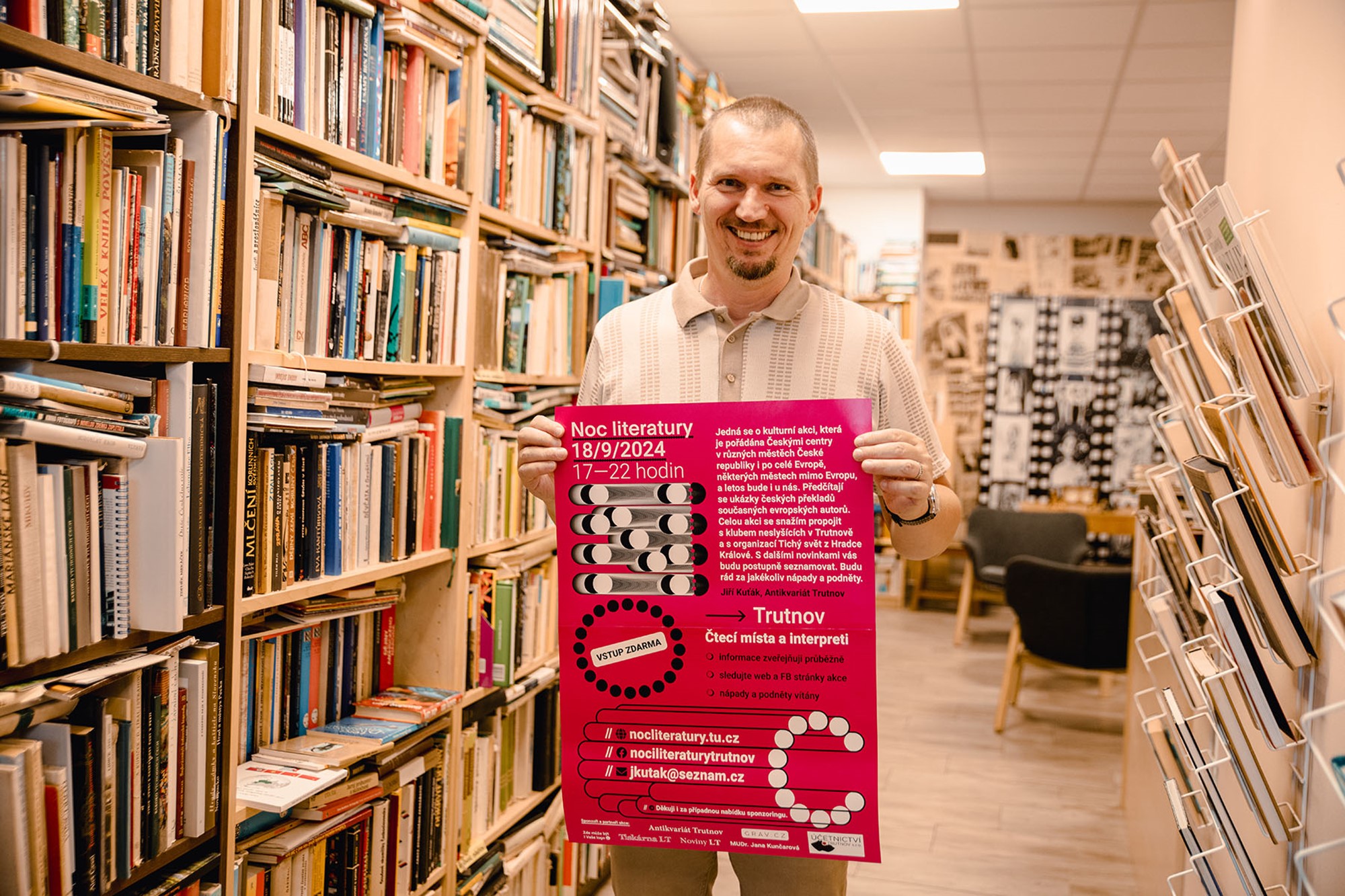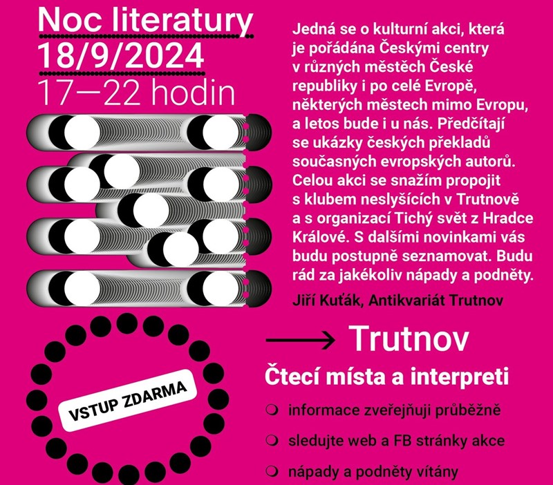 Ukázky z knih současných evropských autorů budou číst Adam Horký, trutnovský rodák a mladý nadšenec pro divadelní kumšt, herečka Anna Veselá pocházející z Brna, ale nyní žijící na Trutnovsku, nebo trutnovský rodák, novinář a moderátor Jan Tuna. „Jsem nadšený a šťastný, že se Noc literatury zabydlí v mém milovaném rodném Trutnově. Měl bych číst v baru Poshta420, v prostoru bývalé kavárny a cukrárny Pod poštou, což je místo mého srdce, které je spojeno s rodinou mé maminky. Ta tady s bráchou vyrostla a její tatínek zde byl vyhlášeným cukrářským mistrem. Moje babička nad kavárnou žila téměř celý život a já tu jako kluk s mojí sestrou strávila mnoho krásných dní a nocí,“ prozradil Tuna.